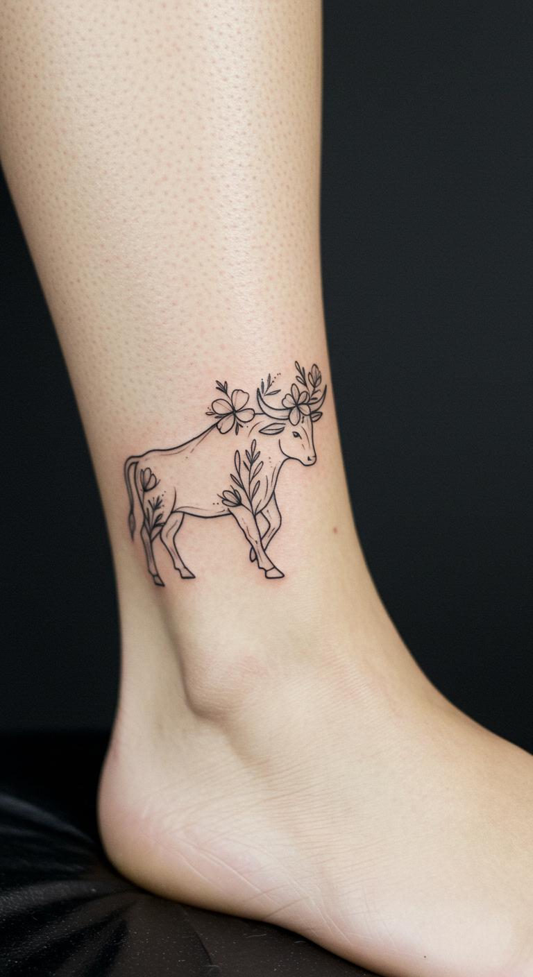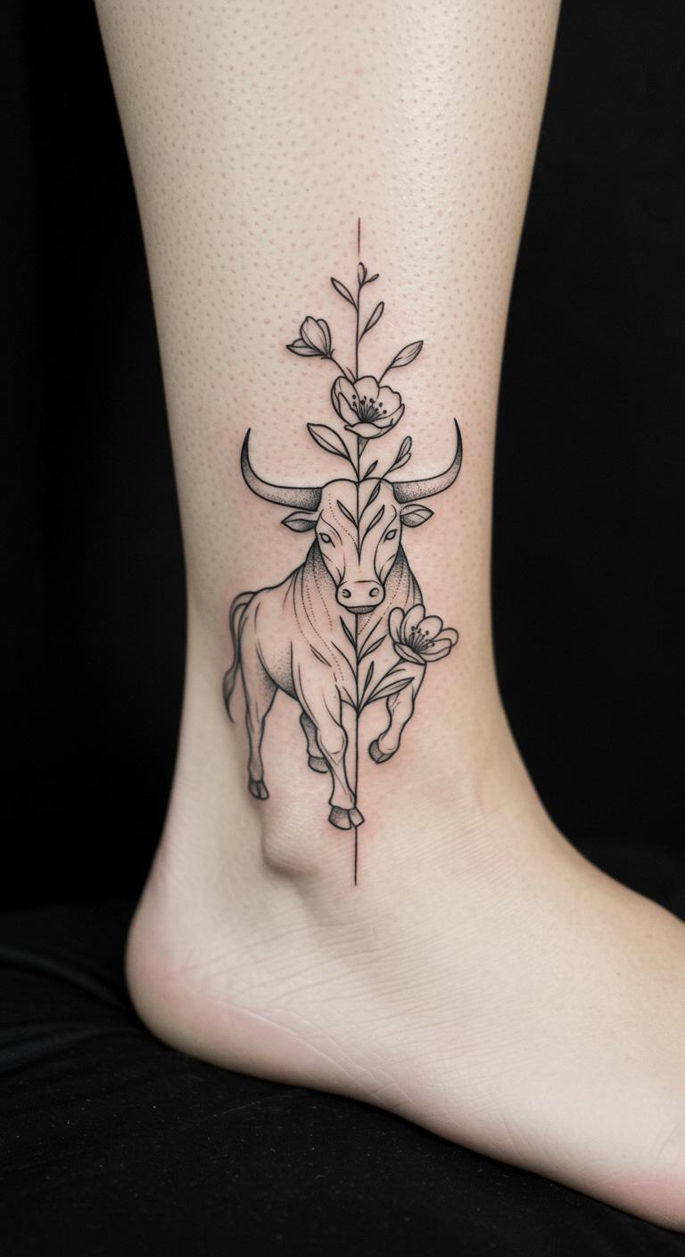 Add flowers to a bull outline on your ankle for a soft Taurus vibe. Flowers wrap around the bull for balance. Sketch flowers and the bull together on a notebook. It’s a quick free activity. Find ankle artists for about $80. Personalize with your favorite bloom. This spot is easy to hide. Try drawing it with markers first. No expensive tools needed. The result feels fresh and meaningful.