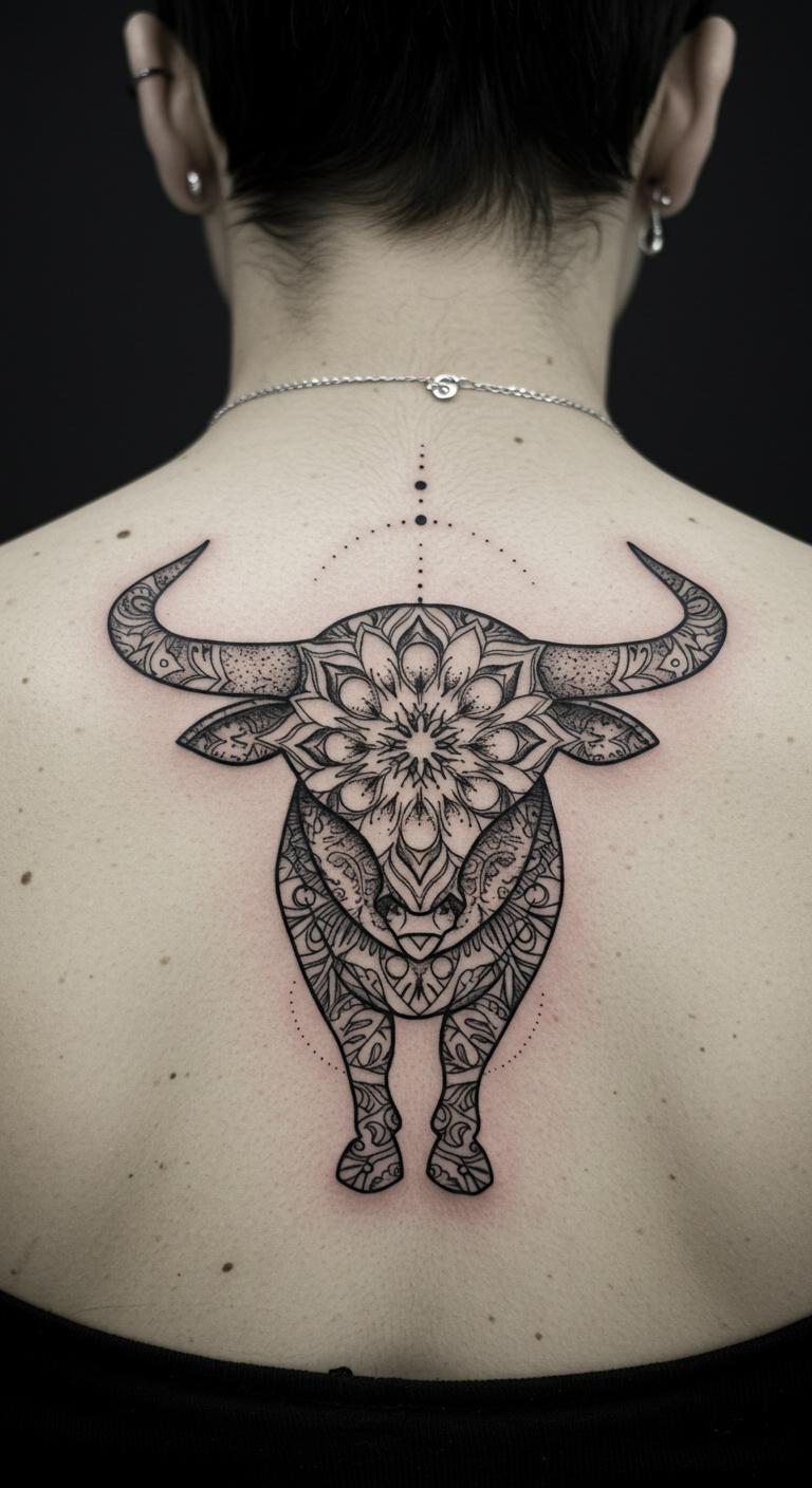 A mandala around a bull on your back modernizes it. Circles and patterns blend. Draw mandalas on paper. Free activity. Back artists at $140. Customize circles. This spot is expansive. Use string art to plan. Budget option. The tattoo circles strength.