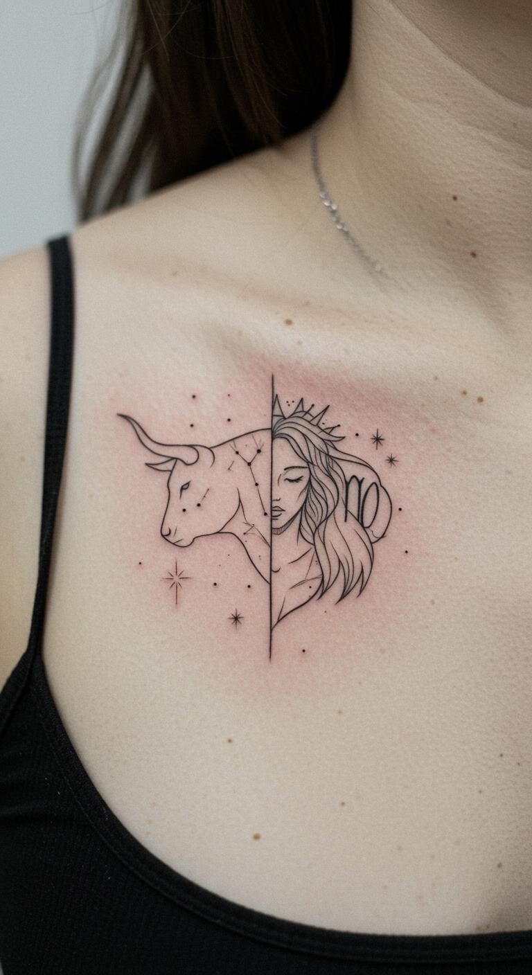 A half Taurus, half Virgo tattoo on your shoulder shows sign harmony. Split the design with a bull on one side and a maiden on the other. It’s great for relationships. Draw both symbols on paper to mix them up. Use free drawing apps for guidance. Artists might charge $150 for this size. Add shared elements like a common line. Place it where you can see it daily. Test with body paint at home for under $10. No big investment required. This idea celebrates connections simply.