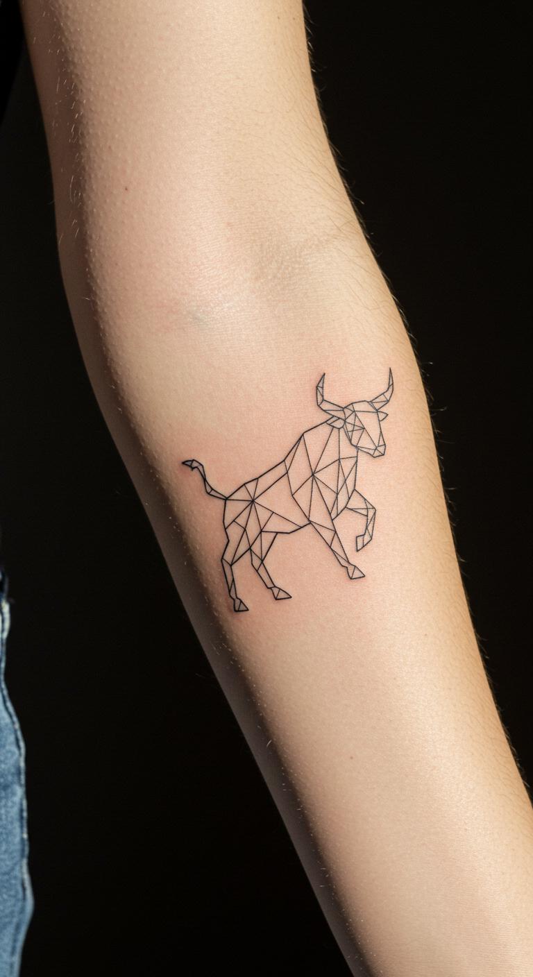 A geometric Taurus on your forearm uses shapes like triangles for the bull. It gives a modern twist to tradition. Start by outlining triangles on paper. Basic supplies cost nothing. Look for deals on geometric tattoos around $100. Make it unique with added angles. This placement suits active lifestyles. Use tape to mock it up at home. Stickers are cheap and reusable. The design ages well with its clean look.