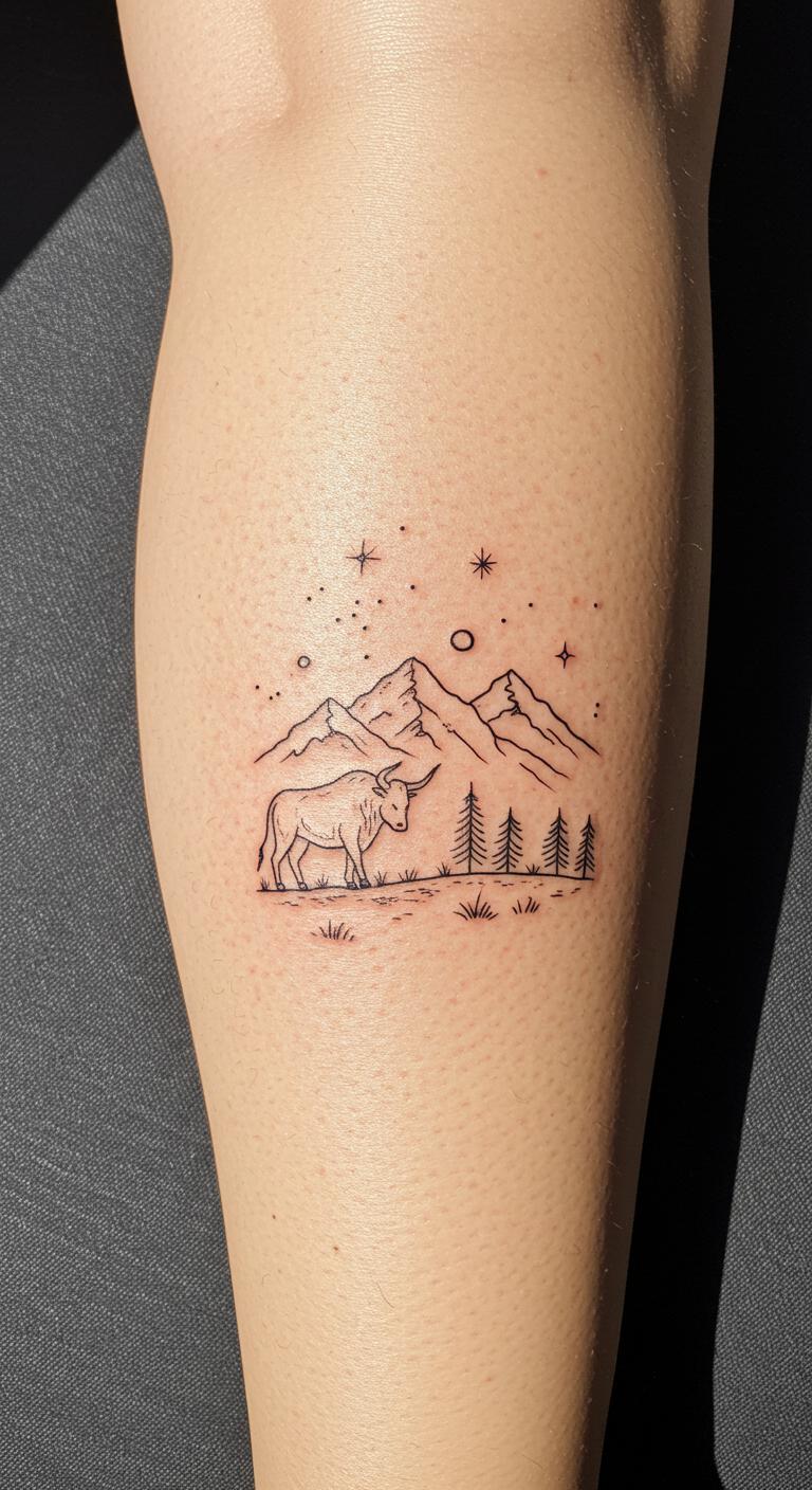 Mountains next to a Taurus bull on your calf ground the design. Lines represent stability. Start drawing mountains and bulls on paper. Free and easy. Artists offer this for $90. Add peaks for your touch. This spot fits athletic wear. Use clay to sculpt a model at home. Costs pennies. The tattoo feels connected to nature.