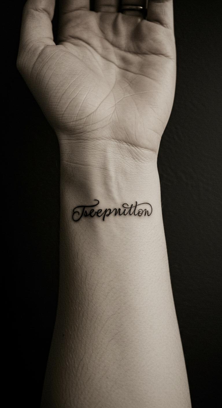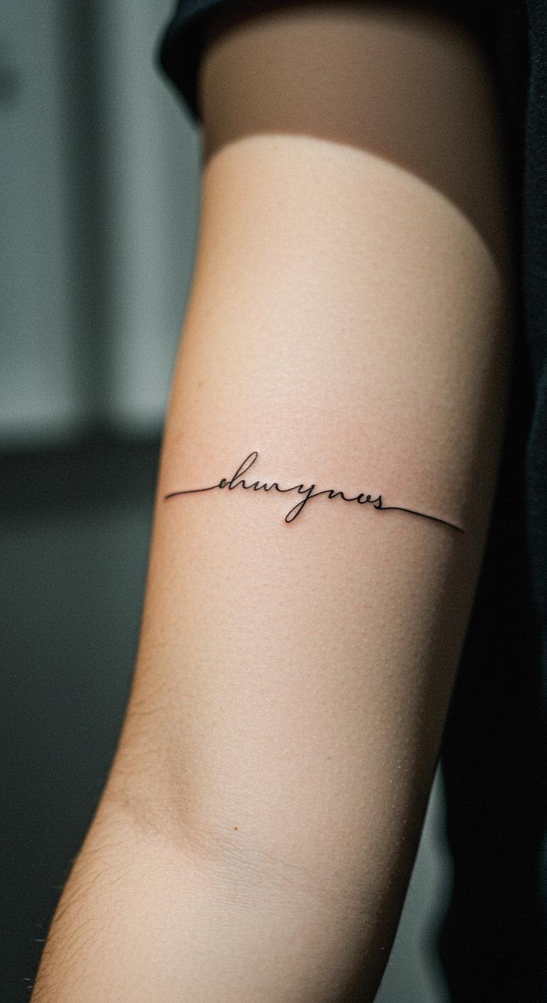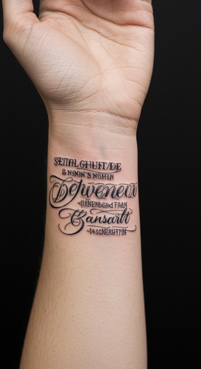 Script phrases on your wrist vary styles. Try writing scripts yourself. Free. Inking for $45. Tailor to you. Expressive and fun.