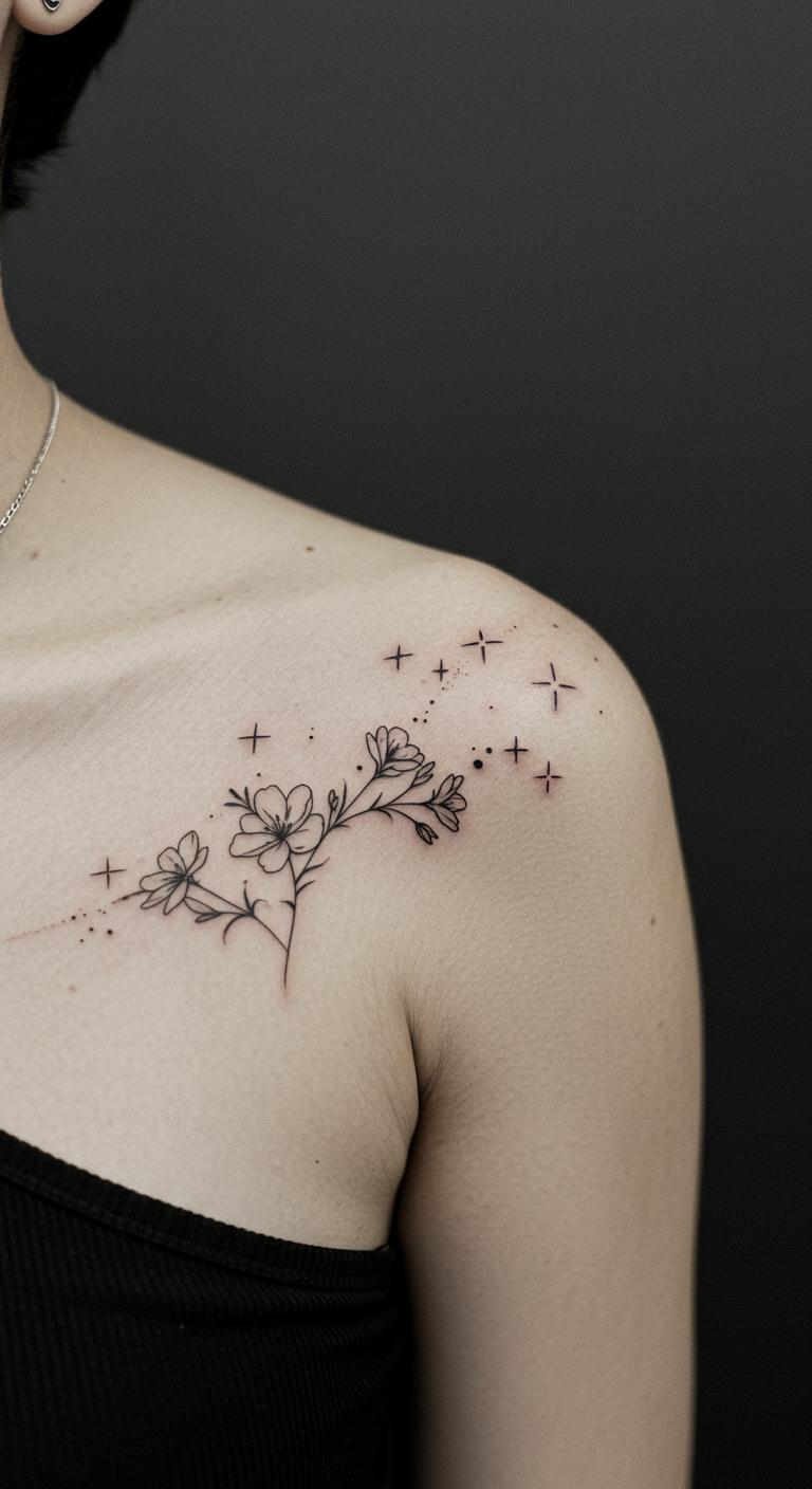Stars and flowers on your shoulder blend subtly. Use flower stickers for practice. Under $2. Real for $60. Add lyrics if wanted. Balanced look.