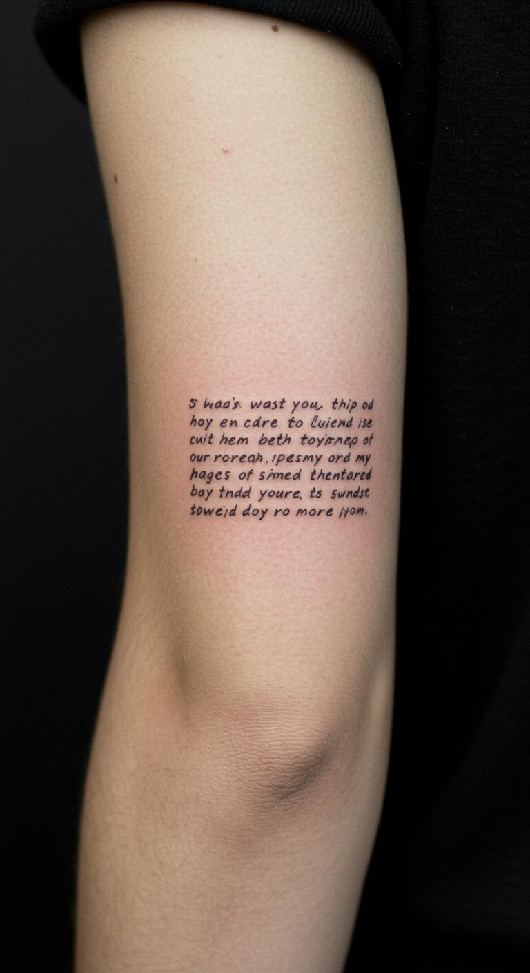 Opt for a neo-traditional lyric on your arm with soft shades. It adds depth without overwhelming. Use colored markers for DIY tests at no cost. Search for artists offering packages around $80. Start small to build up. Include a symbol like a bird for personalization. These designs age well on visible areas. Practice with free online tools. Keep it practical for your routine.