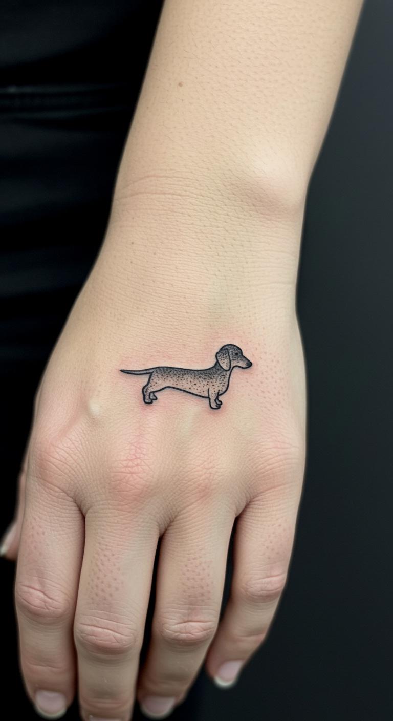 A Dachshund shape adds fun to your ink. Draw it as a simple outline first at home. Use free online templates to trace. This saves money on custom work. Aim for a spot like your finger for quick sessions. Artists often charge by size, so keep it tiny. Pair it with a bow tie element for personality. It honors your pet’s quirky traits. Try temporary stickers before going permanent. They cost just a few dollars. Place it where you see it daily for joy. Share ideas with friends for inspiration. This design works for first-timers. Clean lines make it last longer. Use basic aftercare like lotion from your shelf.