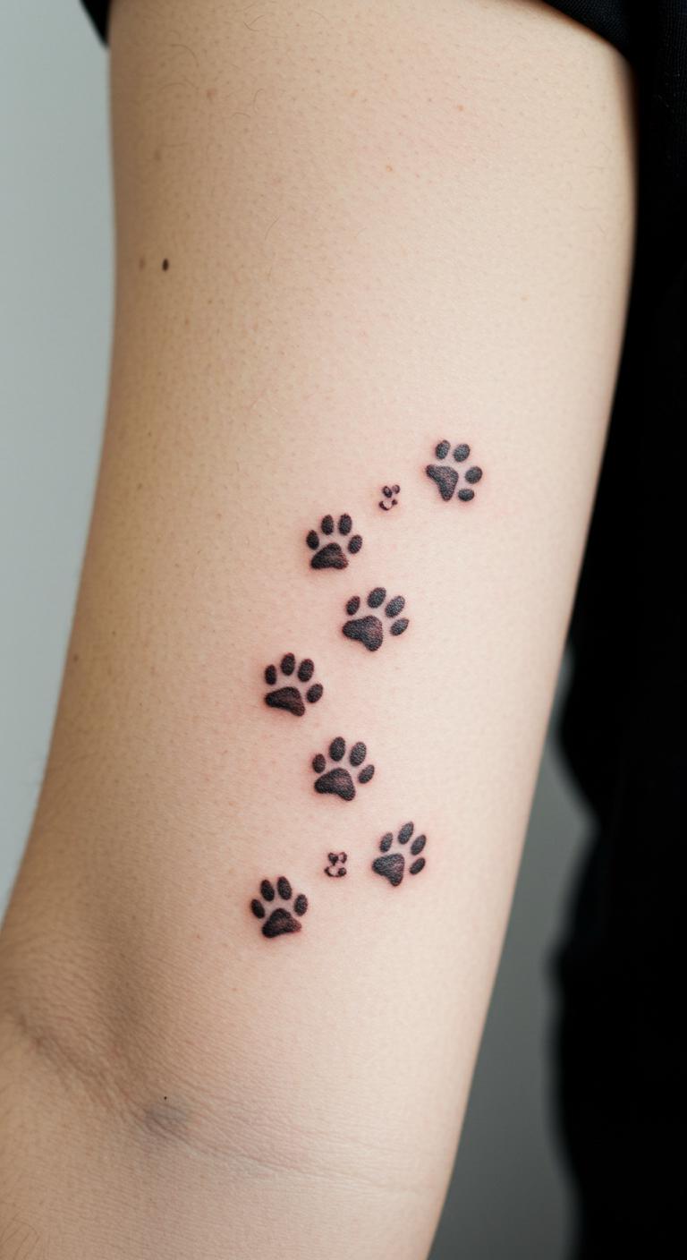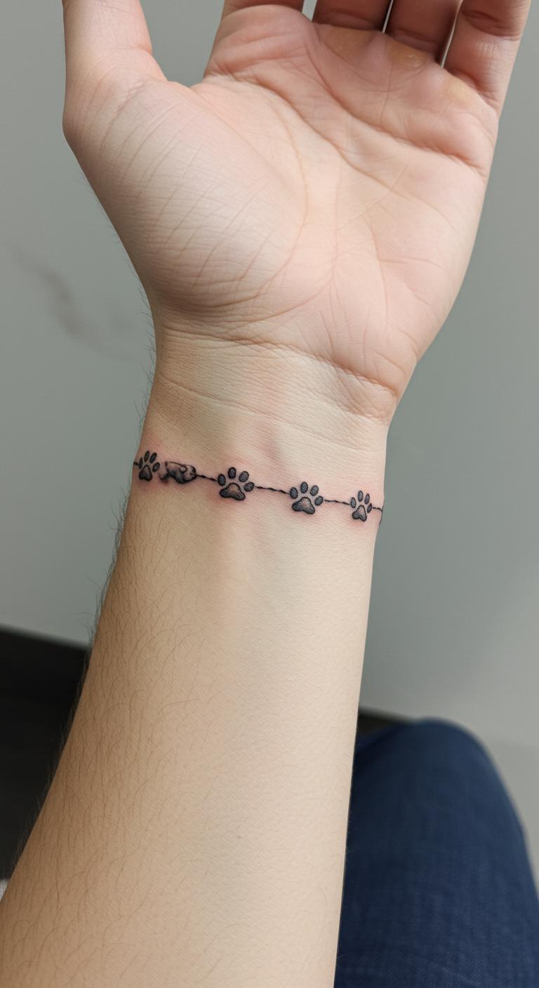 Wrap paw prints around your wrist like a band. Draw a circle on paper to plan. Free band templates help. Get it done in one quick visit. Add beads for flair. Try string bracelets as stand-ins. They cost little. Secure with tape post-tattoo. This design feels like jewelry.