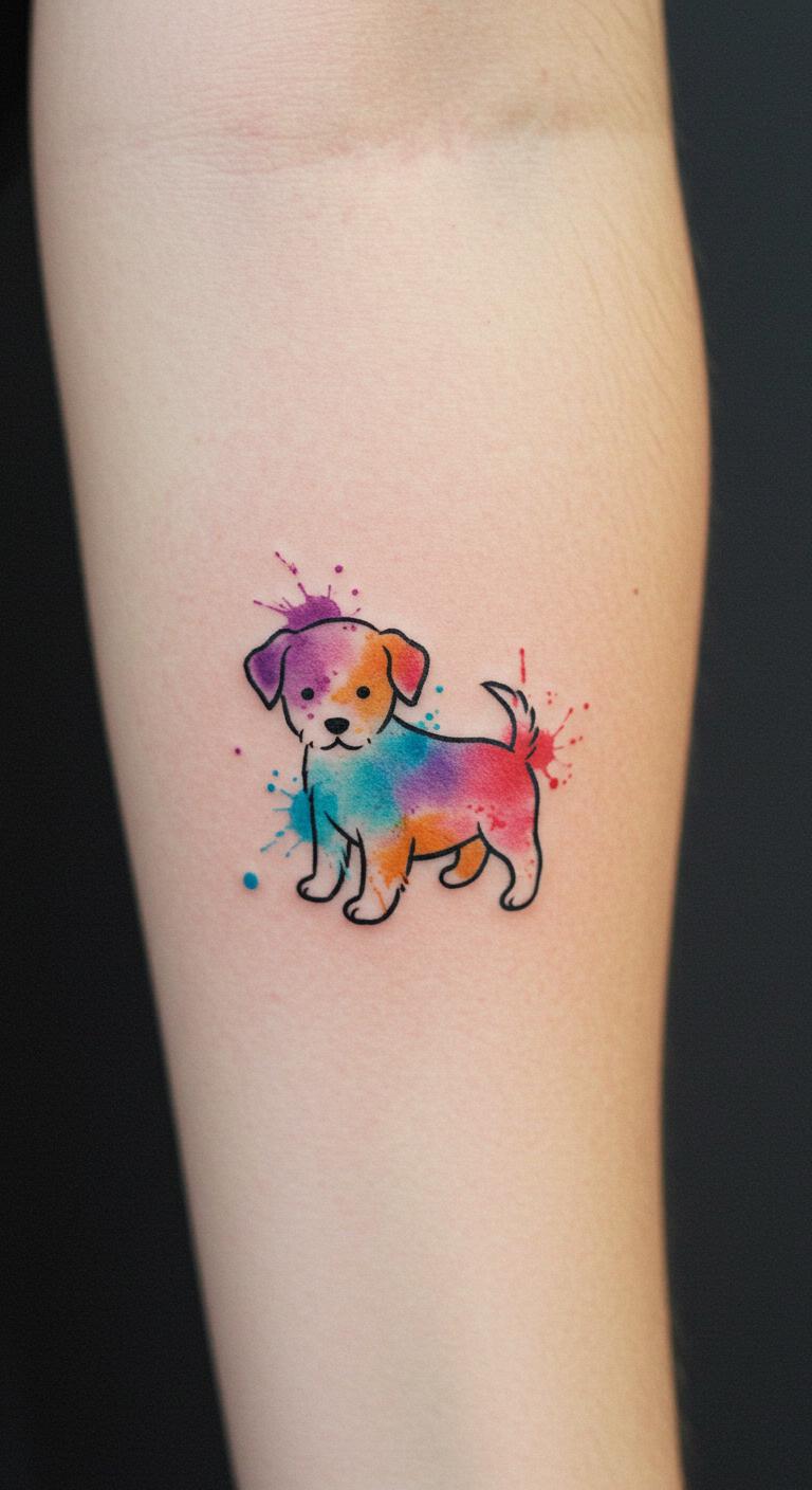 Add watercolor effects around a dog for color. Mix watercolors at home to mimic. Free tutorials show how. Ask for color accents to keep costs down. Place it on your forearm for visibility. Blend in blues for a calm touch. Start with face paints as a trial. They are inexpensive and fun. Choose washable options first. Protect with daily lotion. This brings art to your skin affordably.