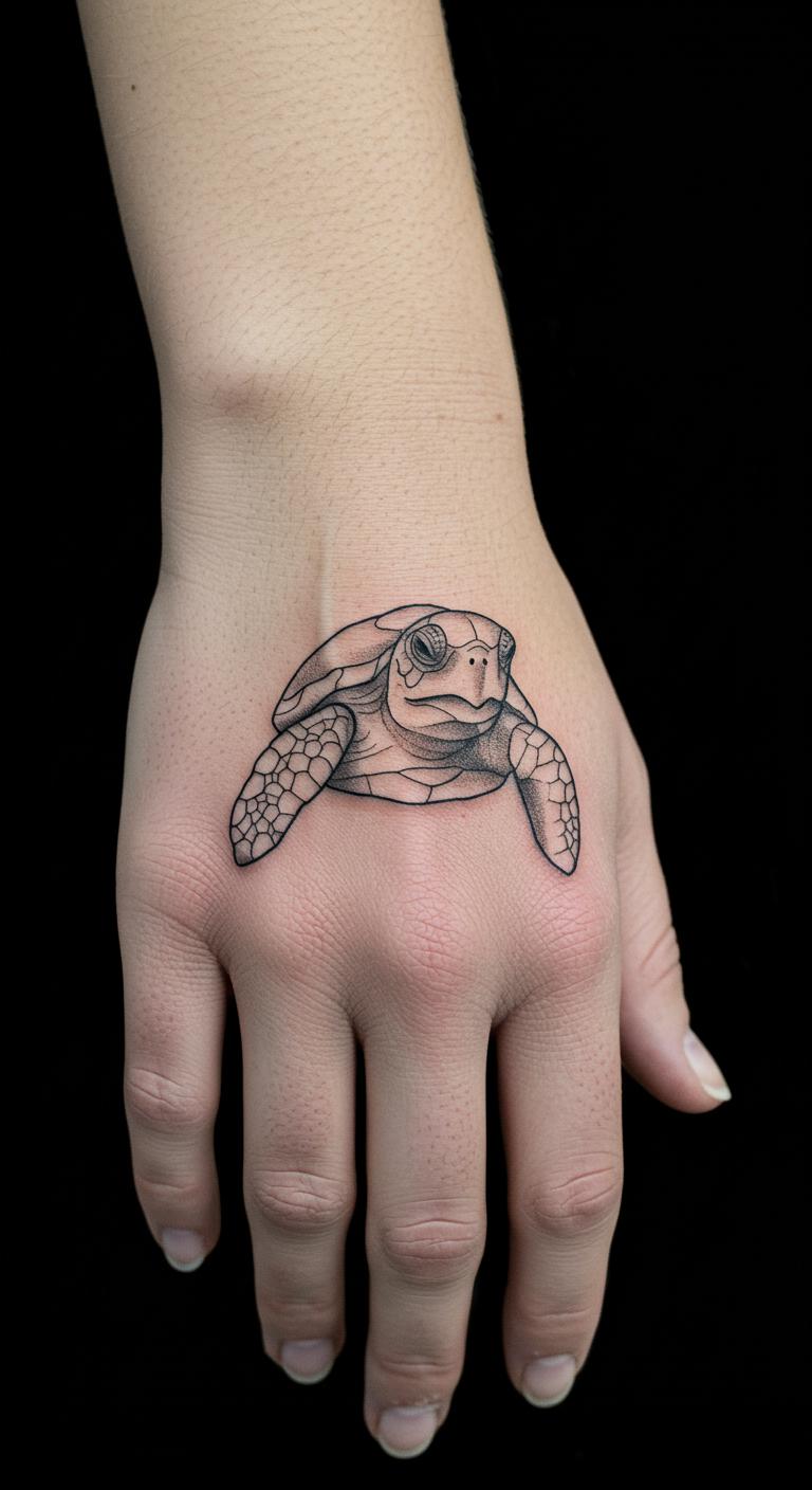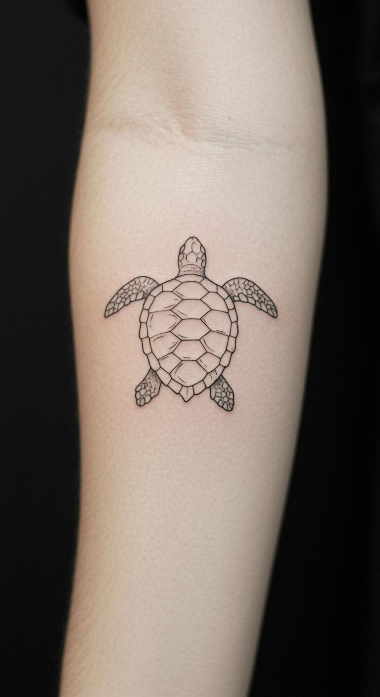 A minimalist sea turtle outline keeps things simple and elegant. Think of a single-line drawing that shows the turtle’s graceful form. This design fits on small spots like your wrist. Start with a basic sketch on paper to plan it out. Use free online tools to create your own version before visiting a tattoo shop. Save money by choosing a local artist over big studios. Break the process into steps: research designs online, draw a rough idea, and get feedback from friends. Bold key elements like the shell curve for emphasis. This tattoo reminds you to move steadily through life. Try a temporary tattoo first to test it. Keep costs low with affordable ink options. Enjoy the subtle beauty without overwhelming details.