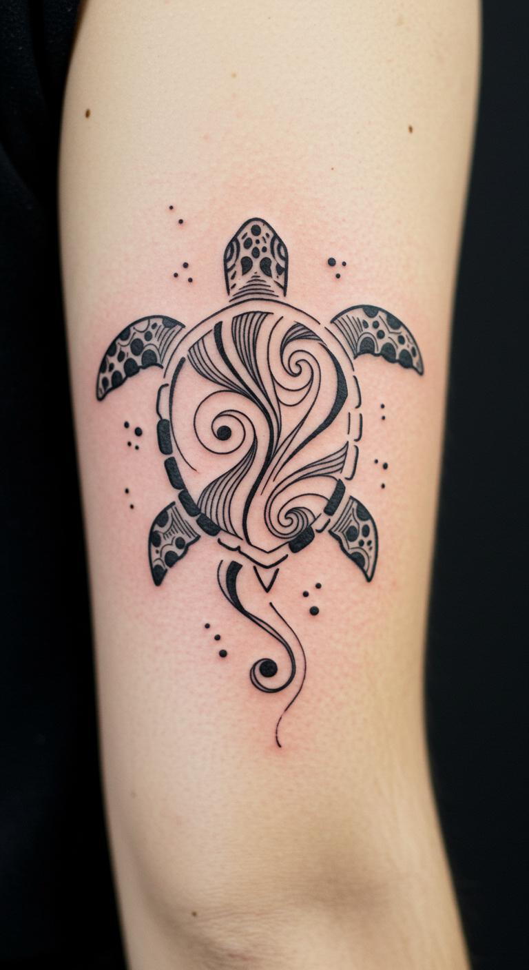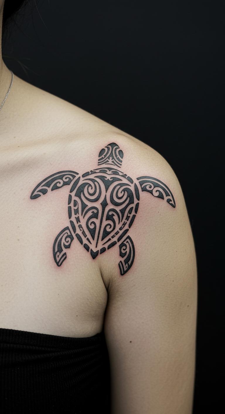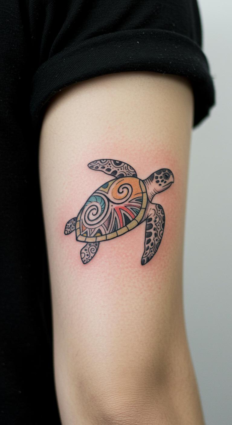 A tribal Polynesian turtle adds cultural depth with bold patterns. Picture interlocking lines that form the turtle’s shape. Place it on your back for a larger canvas. Draw inspiration from free tribal templates online. Experiment at home with henna to mimic the look. Find budget artists through community forums. Focus on simple shapes to keep it easy. This design highlights protection and strength. Use everyday items like markers for practice sketches. Avoid complex additions to stay affordable. Wear it as a personal symbol of resilience.