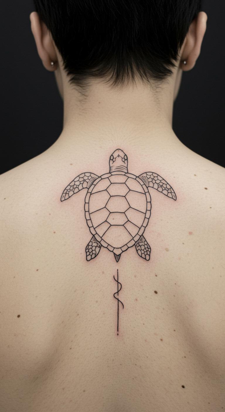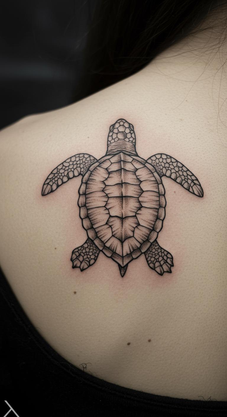 A back-spanning turtle epic makes a statement. Picture a large, simple form across your back. Spread it out for impact. Search epic templates online. Sketch large ideas at home. Choose deals for big work. Bold the span. This design represents grand journeys. Use large paper for trials. Break it into sessions for affordability. Stand tall with this bold art.