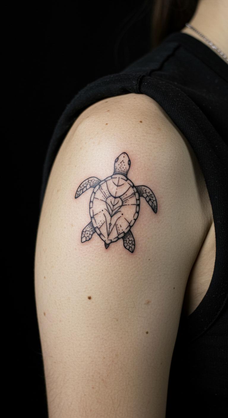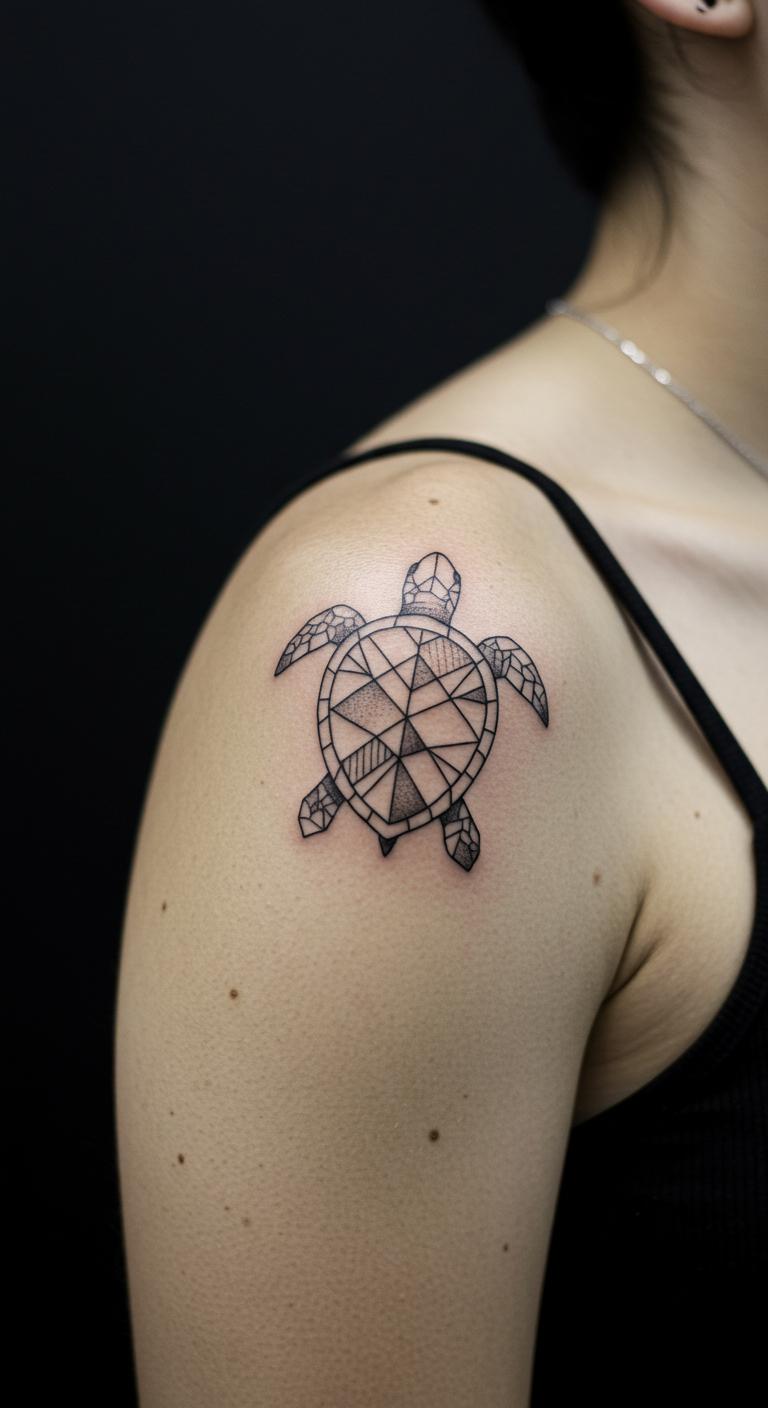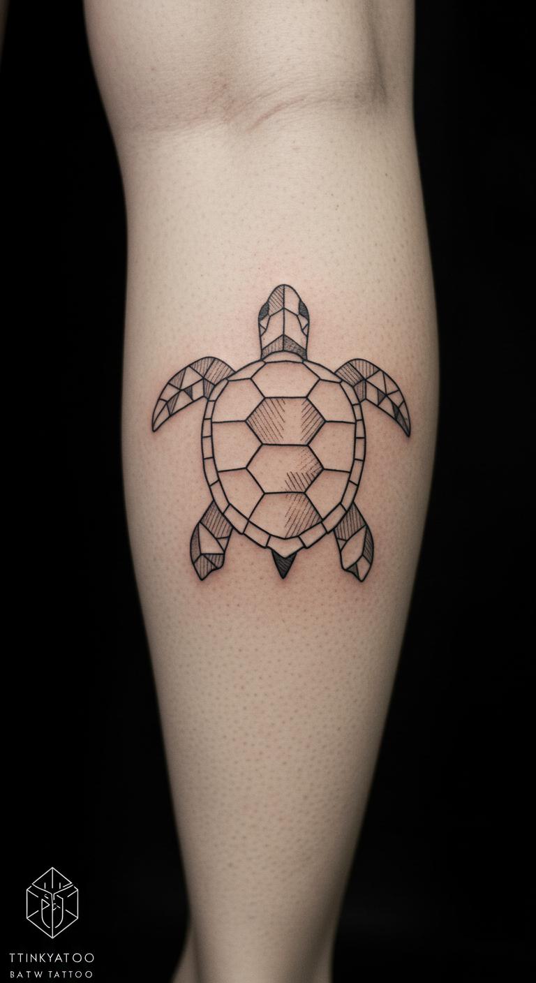 A modern geometric turtle updates tradition. Think angled lines for the turtle. Ink it on your shoulder. Find geometric ideas free. Draw modern shapes. Choose modern tattoo spots. Bold the angles. This design feels current. Test with geometric tools. Use few lines for budget. Step into modernity with it.