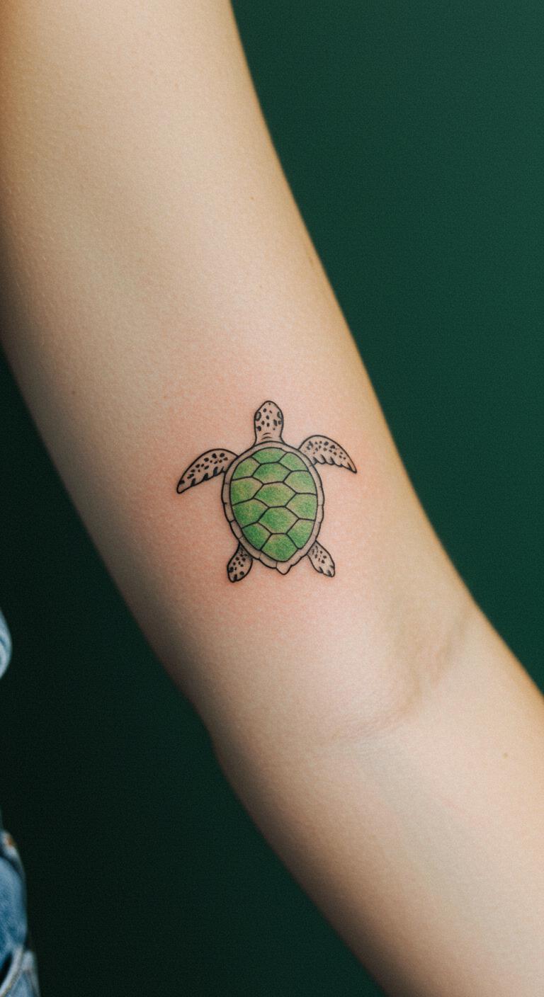 A peaceful green turtle promotes tranquility. See a green outline on your arm. Place it for calm vibes. Access green turtle designs free. Color sketches gently. Select peaceful artists nearby. Bold the green shade. This tattoo brings serenity. Test with green inks. Use minimal green for costs. Find peace in this design.