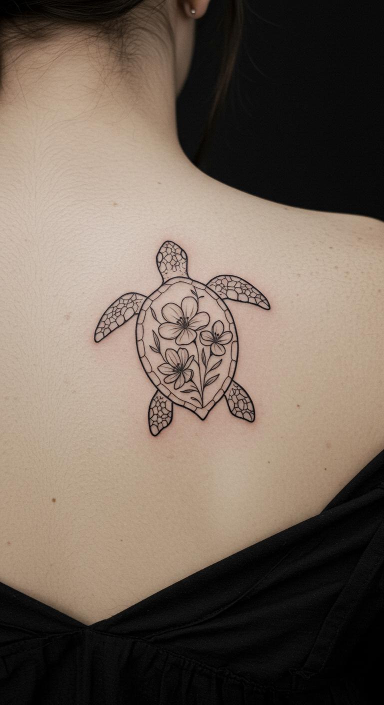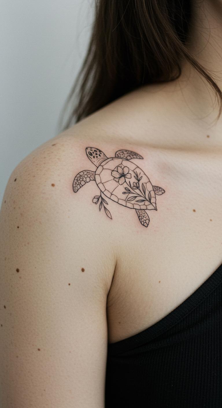 A turtle with floral accents mixes beauty. See a turtle with light flower lines. Place it on your shoulder. Get floral ideas free. Draw accented sketches. Pick accented artists cheaply. Bold the flowers. This design blends elements nicely. Test with floral stickers. Add few accents for affordability. Enjoy the fresh mix.
