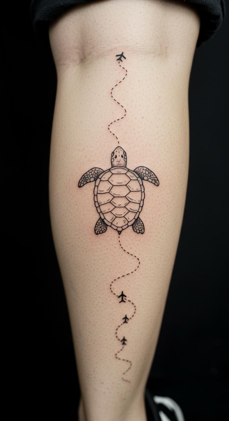 A turtle migration journey tells a story. Picture a turtle with path lines. Tattoo it on your leg for travel. Search journey designs free. Sketch paths at home. Choose journey tattoo options. Bold the paths. This design captures movement. Use path maps for tests. Go simple for budget. Follow your journey with it.