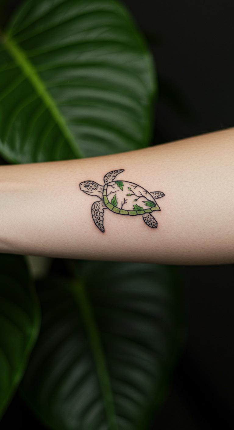 An eco-friendly turtle design supports the planet. See a turtle with nature lines. Place it on your forearm. Find eco sketches online. Draw green ideas. Pick eco tattoo deals. Bold the nature parts. This design aids awareness. Test with eco stickers. Use basic elements for savings. Protect the earth with this tattoo.