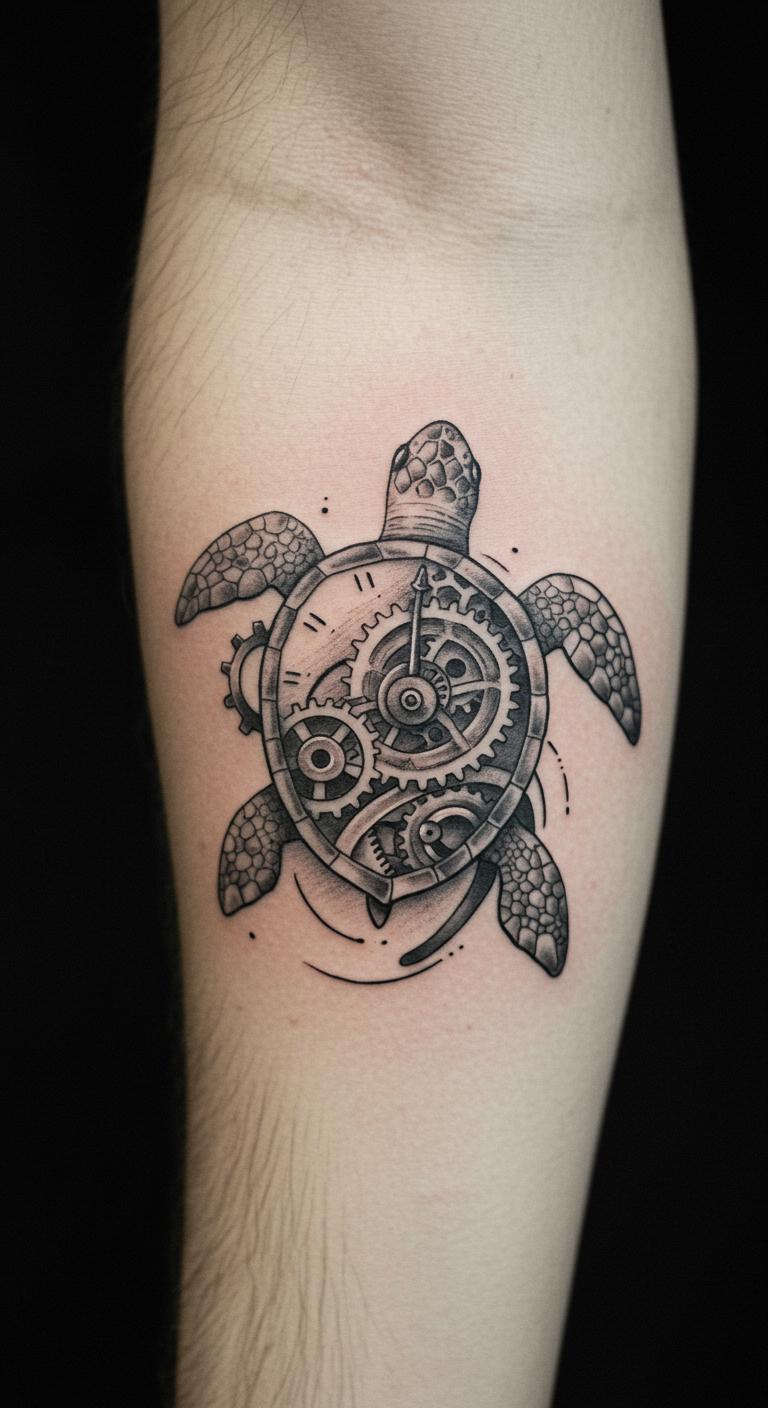 A hybrid clock gear turtle merges time and patience. See a turtle with gear accents. Place it on your arm. Get hybrid designs free. Sketch gear ideas. Pick hybrid tattoo options. Bold the gears. This design symbolizes time. Try gear drawings first. Keep hybrids simple for costs. Blend concepts with this tattoo.