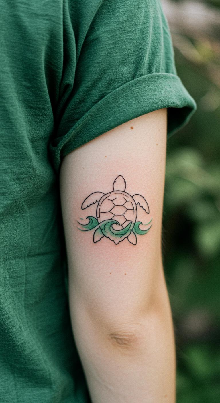 A green sea turtle with waves evokes ocean peace. See a basic turtle shape surrounded by gentle wave lines. Tattoo it on your shoulder for flow. Look up free wave designs online for ideas. Practice with washable markers at home. Choose artists in your area to save on travel. Bold the wave curves for impact. This design promotes harmony with nature. Start with a temporary sticker to preview it. Opt for smaller sizes to keep costs down. Turn it into a relaxing personal statement.