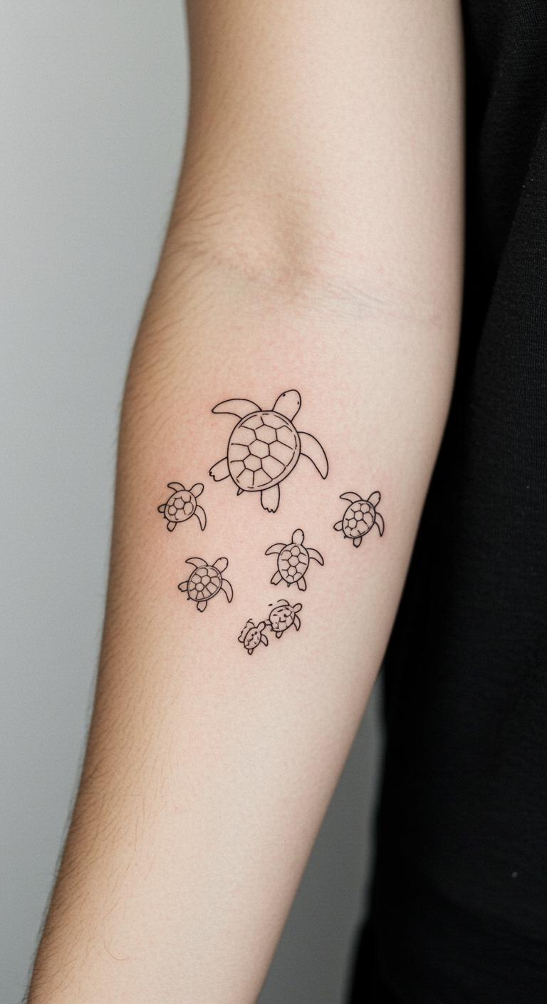 A family of turtles celebrates bonds. Envision several small outlines grouped together. Tattoo them on your forearm for visibility. Search free group designs for ideas. Sketch groups on paper at home. Find deals at walk-in studios. Bold the group arrangement for focus. This design signifies community support. Test with waterproof pens first. Choose compact layouts to lower costs. Make it a heartfelt family tribute.
