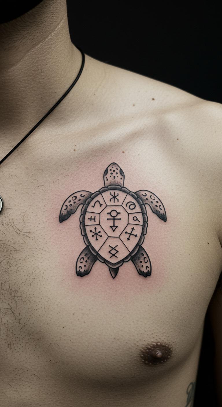 A protective turtle amulet offers a shield vibe. See a turtle with subtle symbol lines. Put it on your chest for strength. Use free amulet patterns online. Practice drawing with everyday pens. Opt for inexpensive artists. Bold the protective elements. This tattoo conveys safety and endurance. Try ink stamps for trials. Keep it straightforward for affordability. Wear it as a daily guard.
