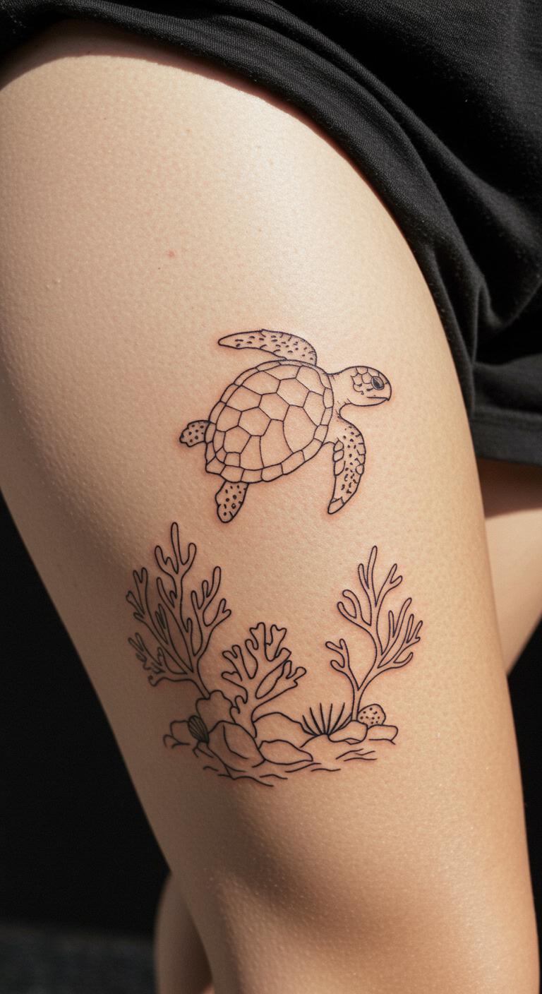 A coral reef turtle scene merges sea life. Picture a turtle with basic coral accents. Place it on your thigh for space. Look for reef sketches online. Create scenes with markers. Choose nearby affordable options. Bold the coral forms. This tattoo highlights environmental ties. Test with scene stickers. Keep elements minimal for budget. Dive into nature’s story with it.