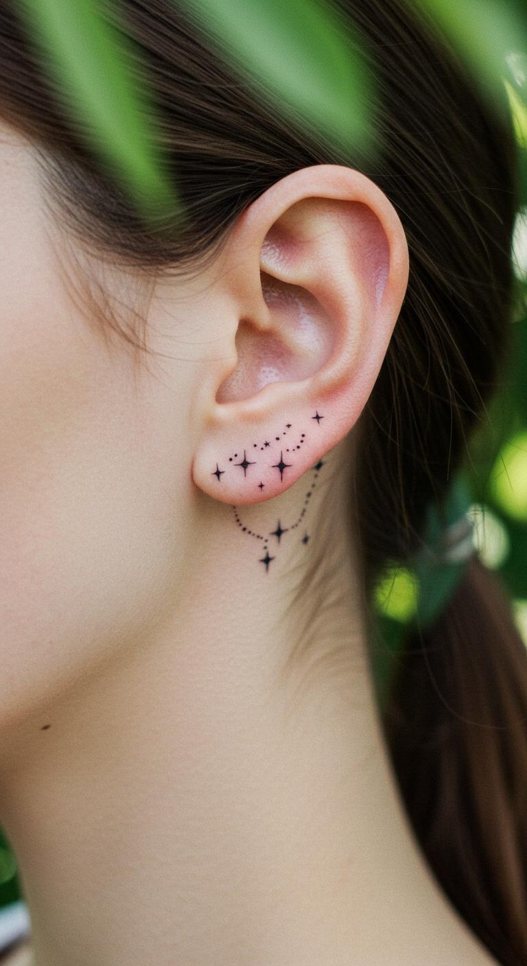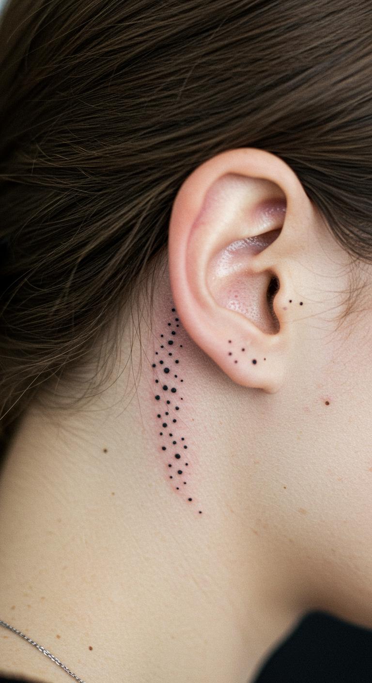 A small cluster or line of dots behind the ear offers minimalist flair with less pain and cost. Dotwork adds subtle texture, creating quiet but interesting designs. This style is perfect for first-timers or anyone wanting an easy-to-hide tattoo. For DIY flair, you can arrange dots in patterns like triangles, waves, or constellations, sketch ideas on paper, and share with your artist.